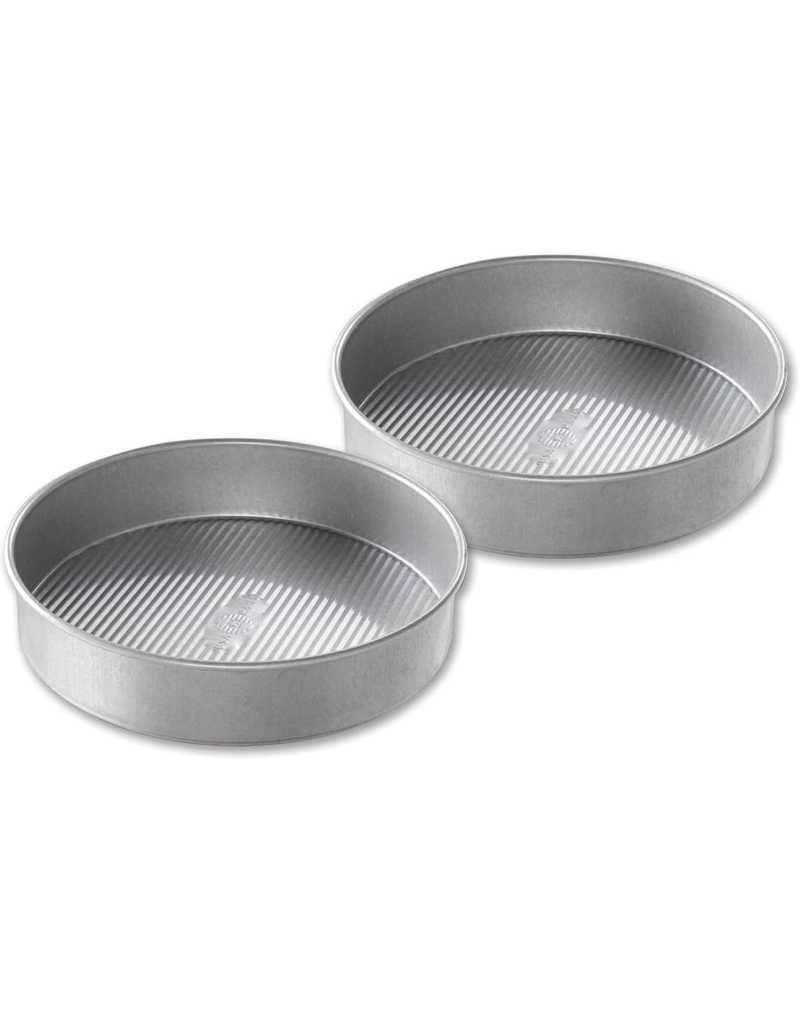 The set of 2 USA Pan 9-Inch Round Cake Pan measures a full 9 x 2 inches* and makes the perfect choice for baking decadent classic cakes. This pan will bake your favorite cake recipes like chocolate or red velvet, perfectly. The cake pan surface is coated with AMERICOAT Plus, a patented non-stick silicone, allowing you to easily release your cake from the pan. The non-stick feature makes clean-up truly effortless. AMERICOAT Plus is also PTFE, PFOA, and BPA free. Every USA Pan is made in the USA and has been designed with the same standard high performance features that commercial bakers enjoy including aluminized steel and heavy gauge steel construction that allows for even heat distribution and maximum service life. The set of 2 USA Pan 9-inch Round Cake pan’s unique fluted surface design facilitates air circulation and also maximizes pan strength, which helps to resist warping. USA Pan’s professional grade bakeware helps everyday home bakers produce professional grade baked goods. USA Pan bakeware is long-lasting, durable, reliable. USA Pan is a Bundy Family owned company, based in the Greater Pittsburgh, Pennsylvania area that has been producing high performance bakeware for over 50 years. *Dimensions represent baking surface, not overall pan size. Baking Surface Dimensions : 9 x 9 x 2 inches, Outer Dimensions: 9.5 x 9.5 x 2 inches